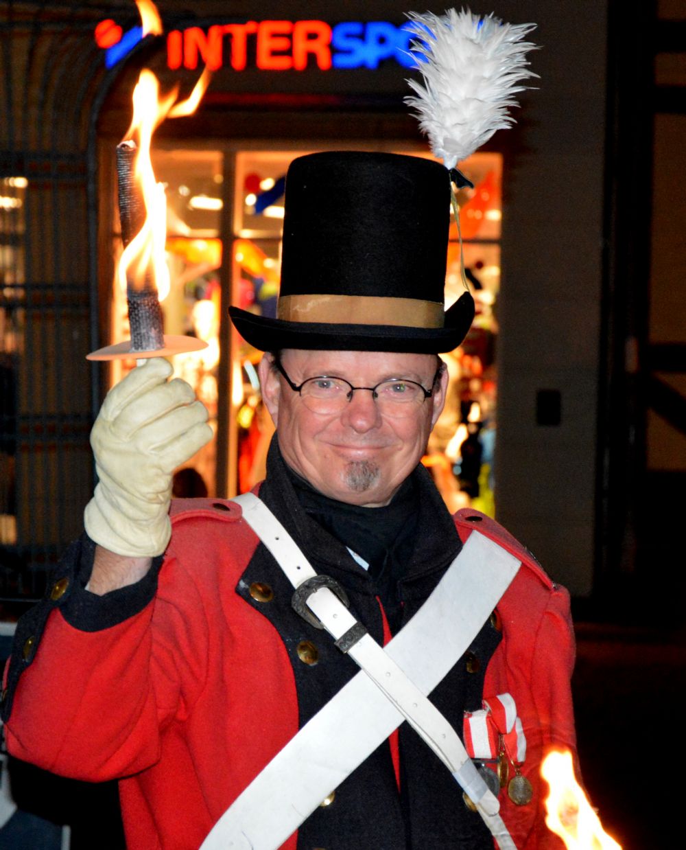 Billederne ovenfor og til venstre er fra Faaborg Handelsstandsforening 150 års jubllæum som blev markeret med bl.a. fakkeltog gennem byen d. 10. oktober 2014. Den glade kanoner til venstre er Johannes Snedker. (Foto: Jørn Ungstrup, Faaborg)